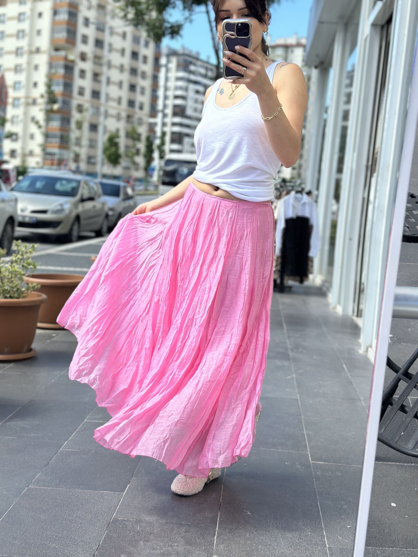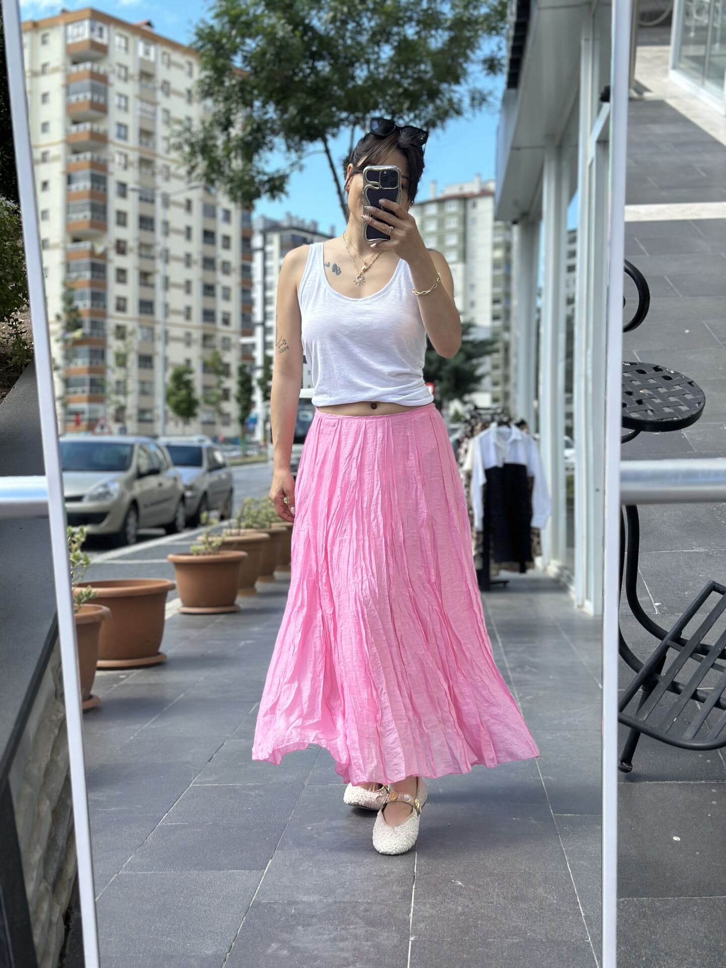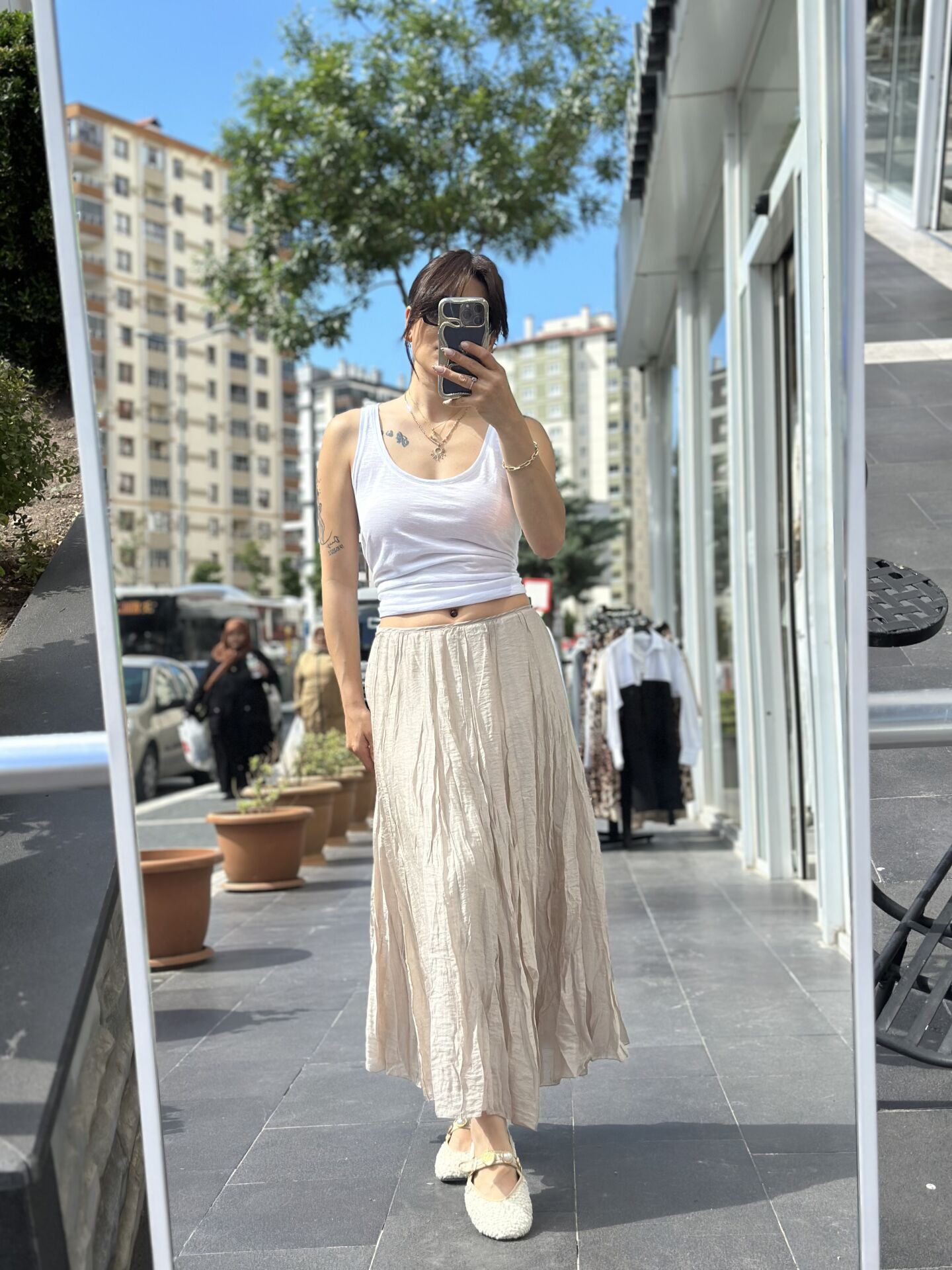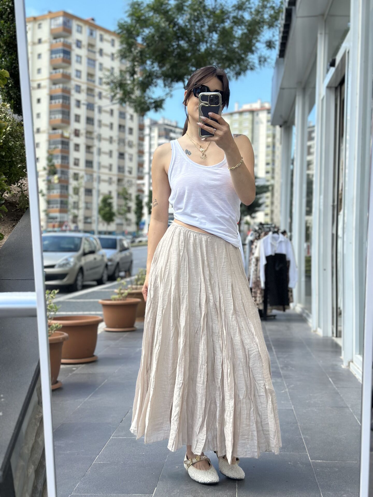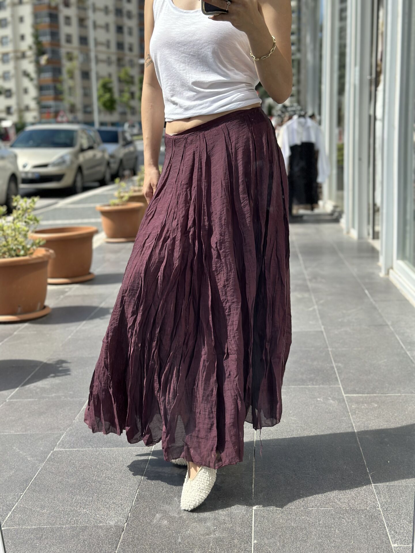 Bu kırışık kumaş etek, şık ve rahat bir görünüm için mükemmel seçimdir. Yumuşak ve hafif kumaşı ile gün boyu konfor sağlarken, şık tasarımıyla da her ortama uyum sağlar. Kırışıklıklara izin veren dokusuyla bakımı kolaydır ve her zaman mükemmel bir görünüm sunar. Gardrobunuzun vazgeçilmez parçası olmaya aday!