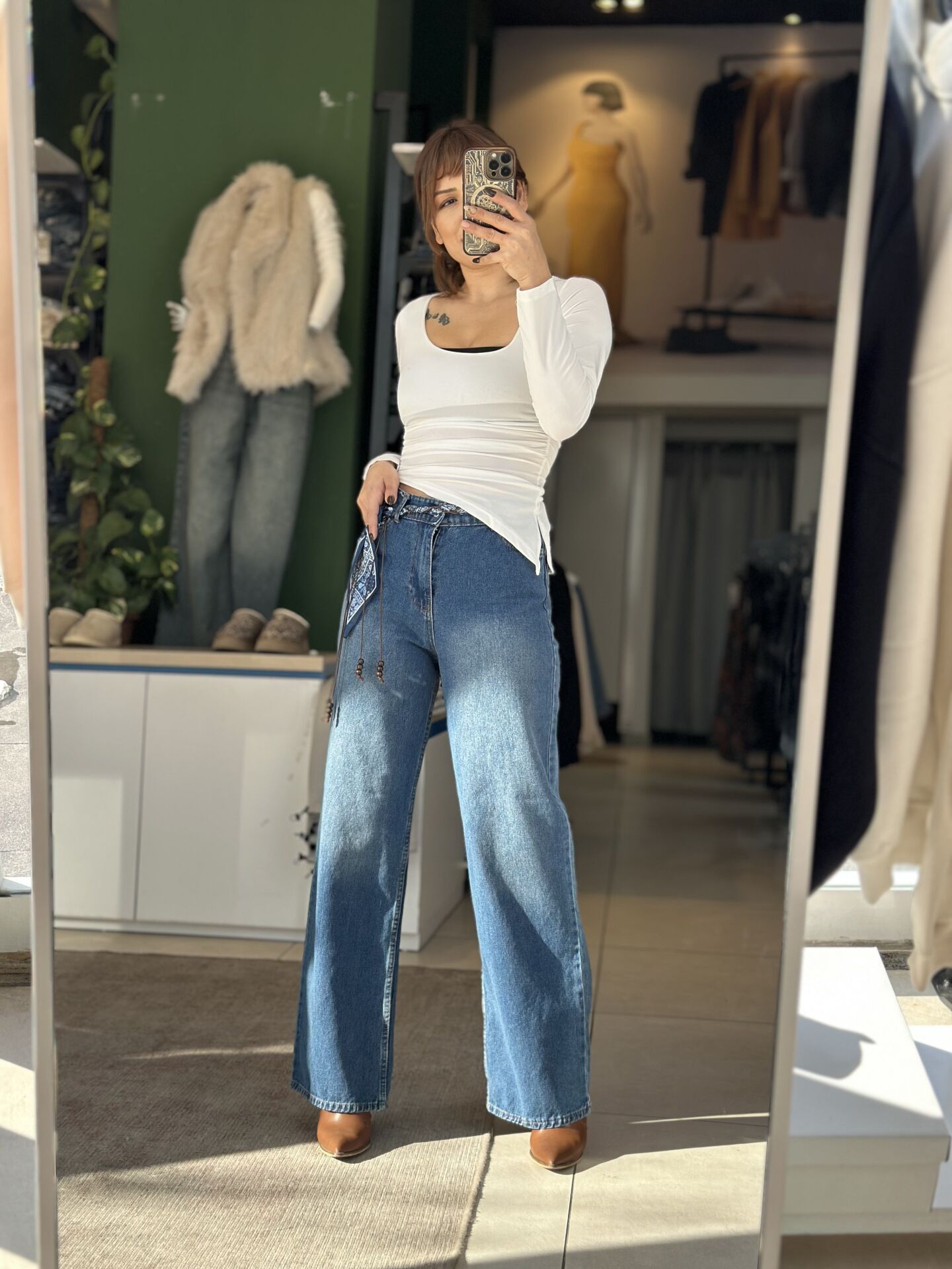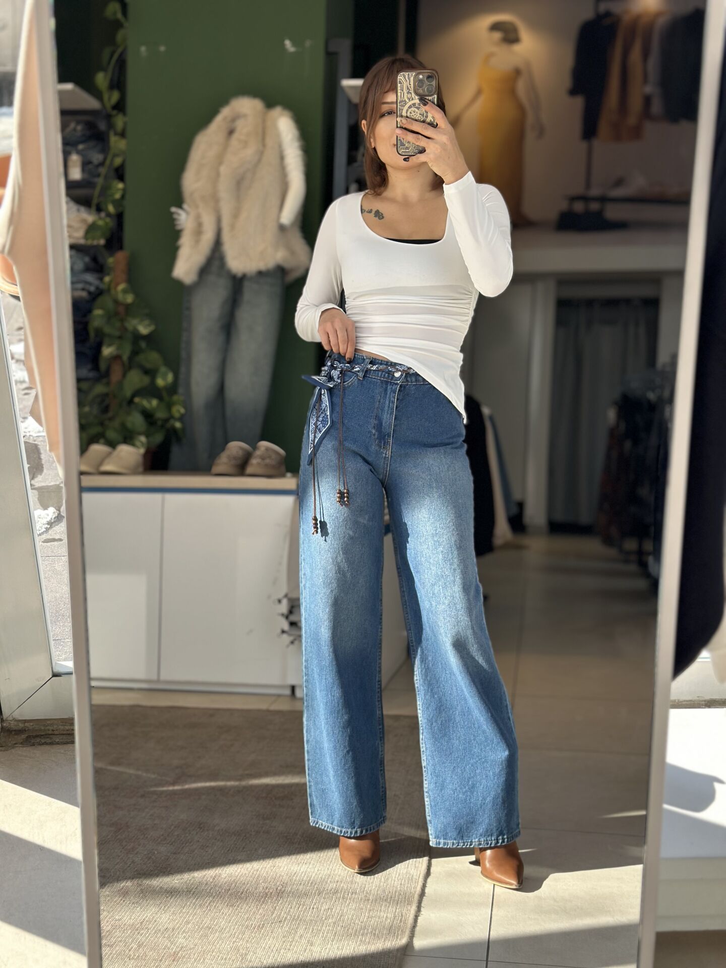Kemeri Fular Detaylı Bol Paça Pantolon.Kemeri Fular Detaylı Bol Paça Pantolon