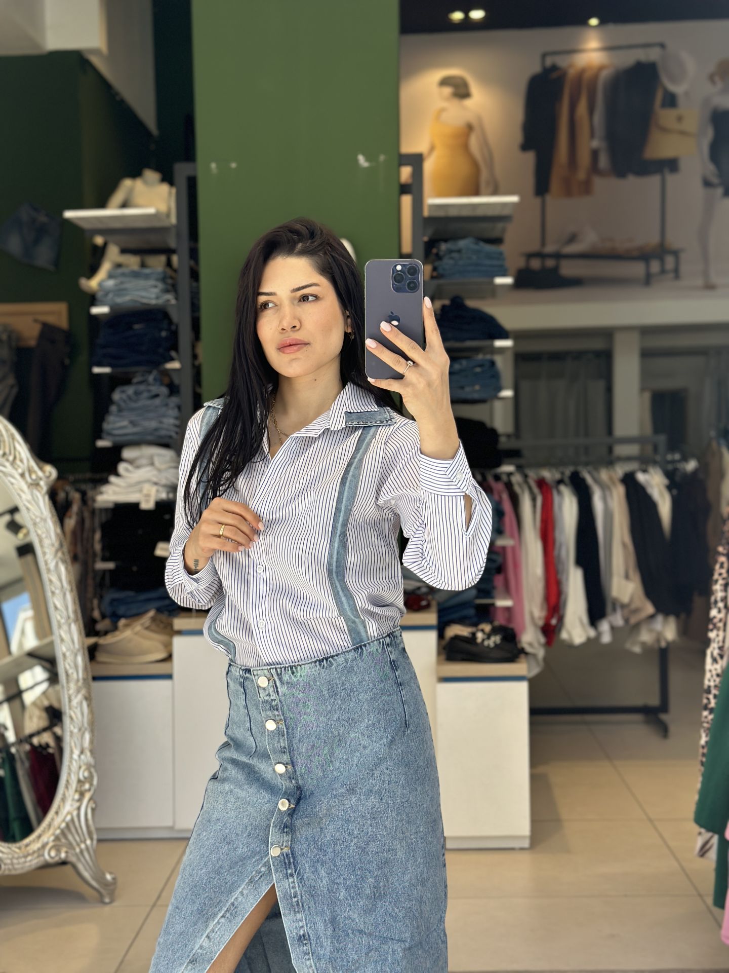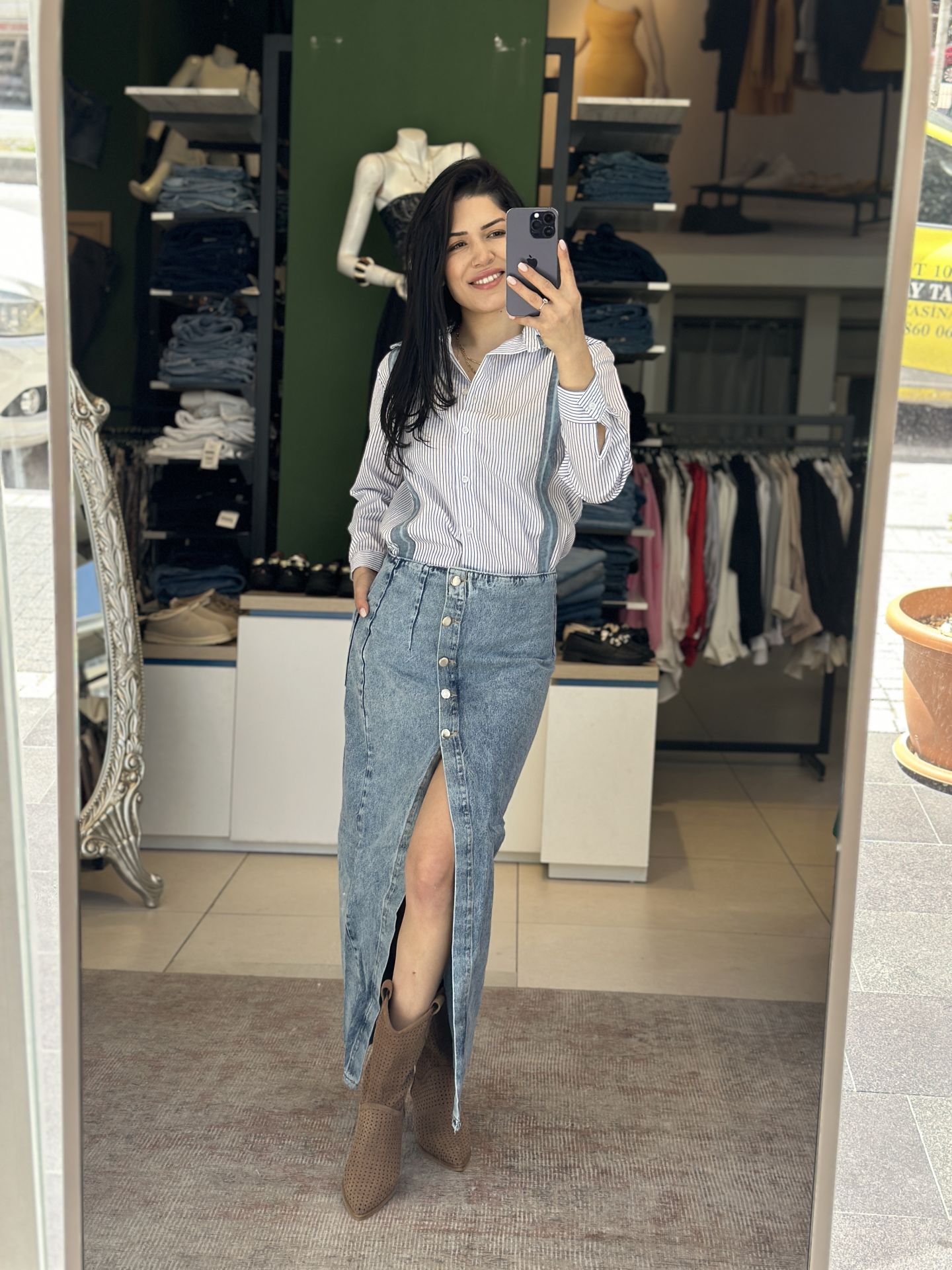 Bu şık kot şeritli gömlek, mükemmel bir kombin parçasıdır. Kaliteli kot kumaşı ve modern şerit detayı ile hem rahat hem de şık bir görünüm sunar. Günlük kullanım için ideal olan bu gömlek, her tarz pantolon veya etekle uyumlu bir seçenektir. Gardırobunuzun vazgeçilmezi olmaya aday!