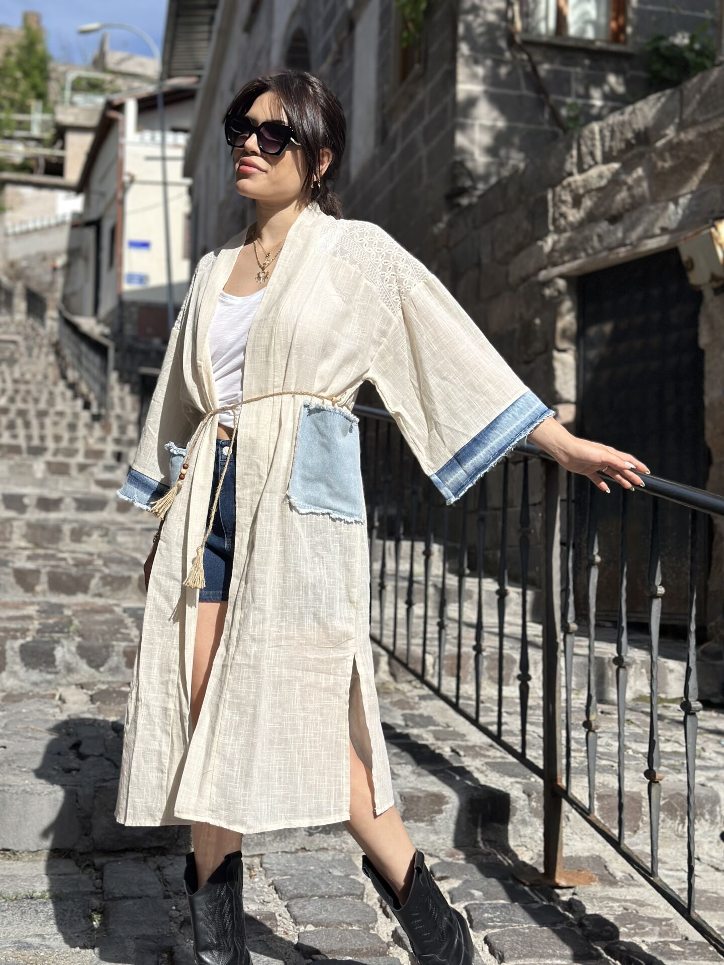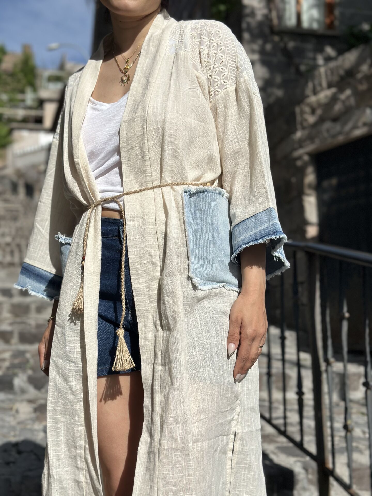 Bu muhteşem kot kimonoyu gördün mü? Zarif detayları ve rahat kesimiyle benzersiz bir tarz sağlar. İster günlük kullanım ister özel bir etkinlik için olsun, bu kot garnili kimono her durumda mükemmel bir seçimdir. Her detayıyla dikkat çeken bu kimonoyu hemen keşfedin!