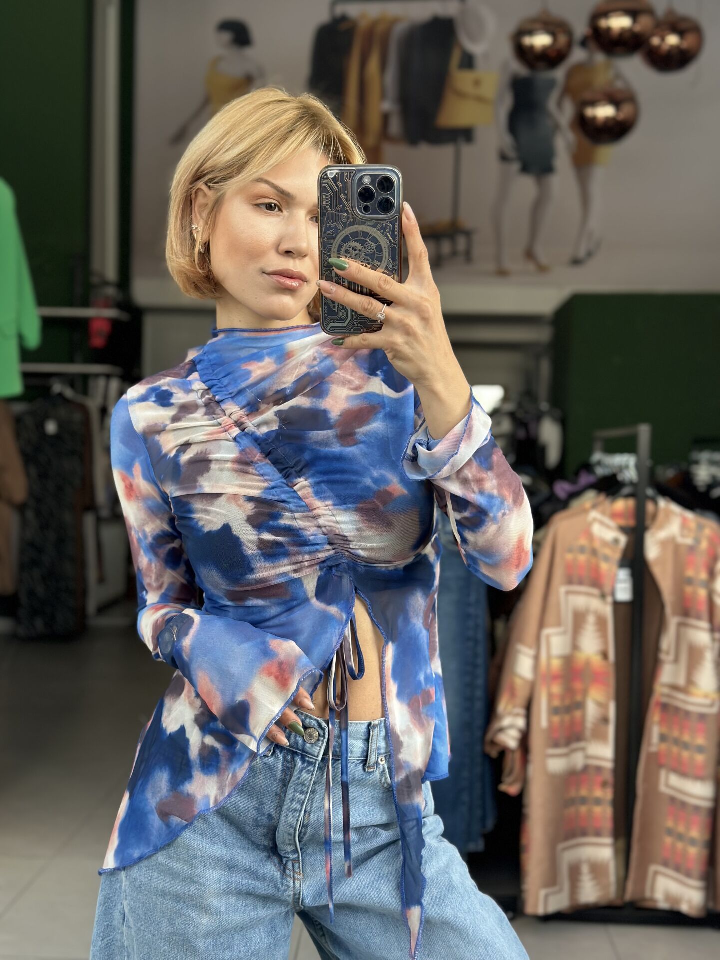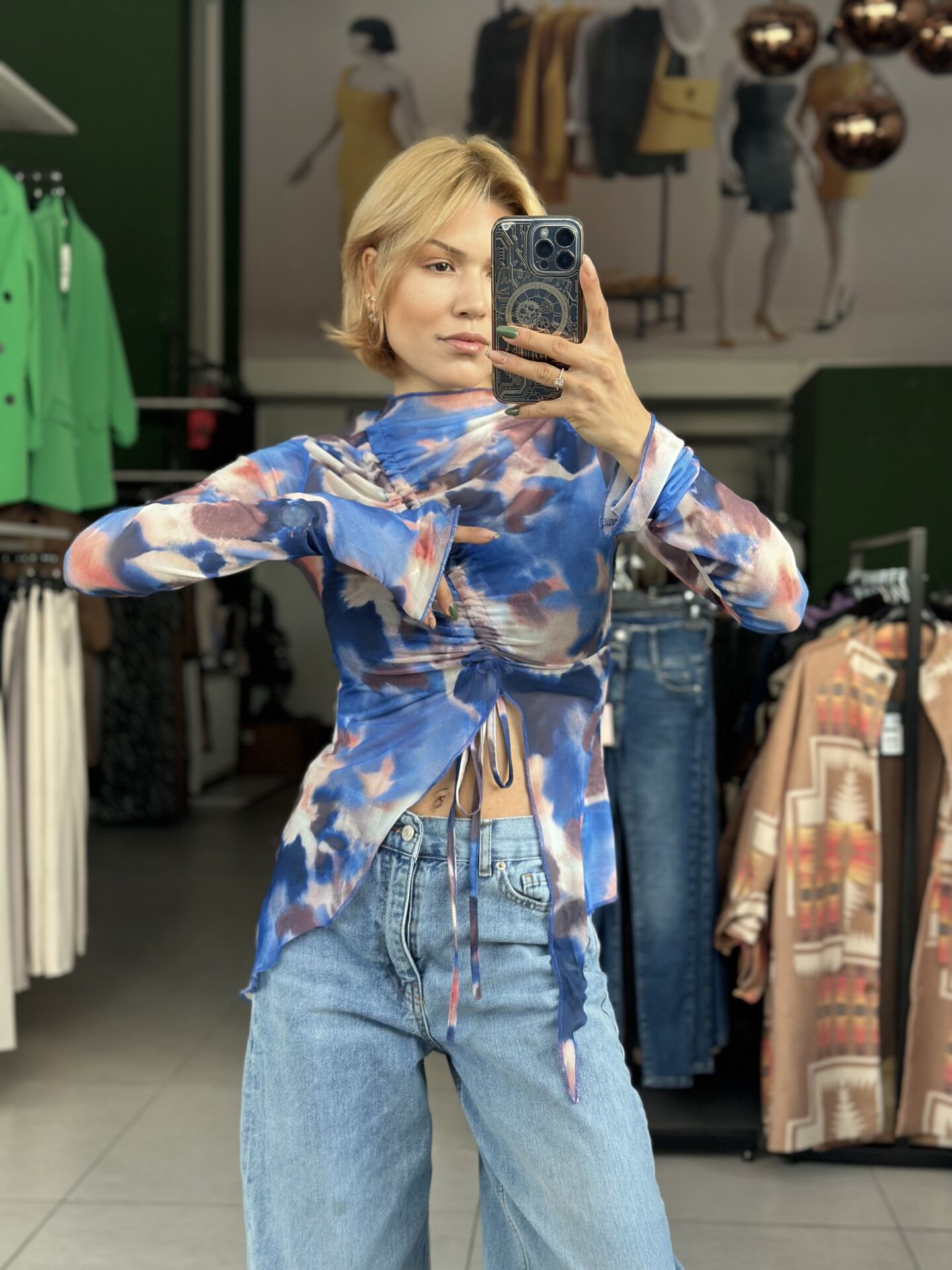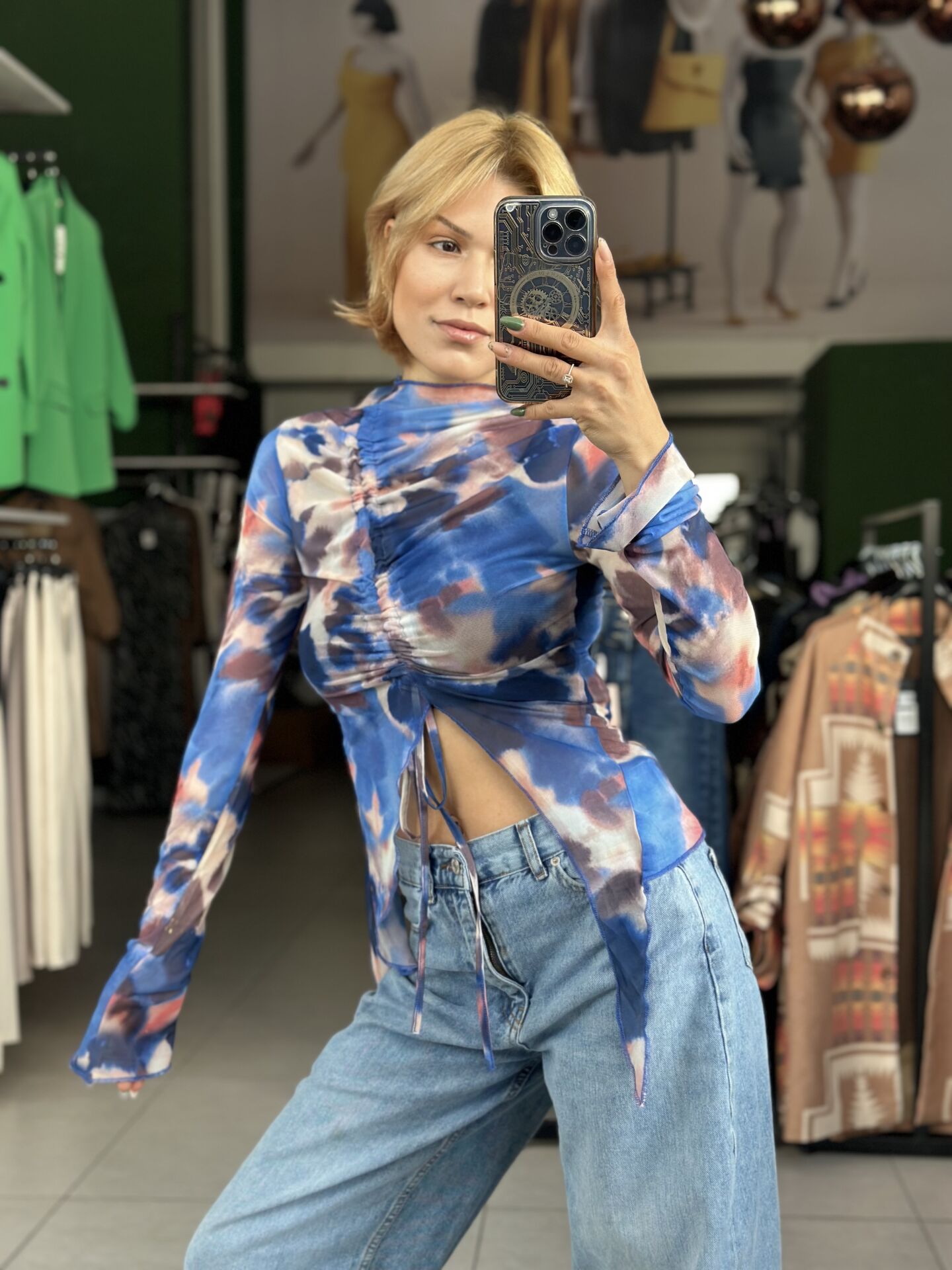 Önü Bügülü Desenli Tül Bluz Önü Bügülü Desenli Tül Bluz. SCST2784 Önü Bügülü Desenli Tül Bluz
