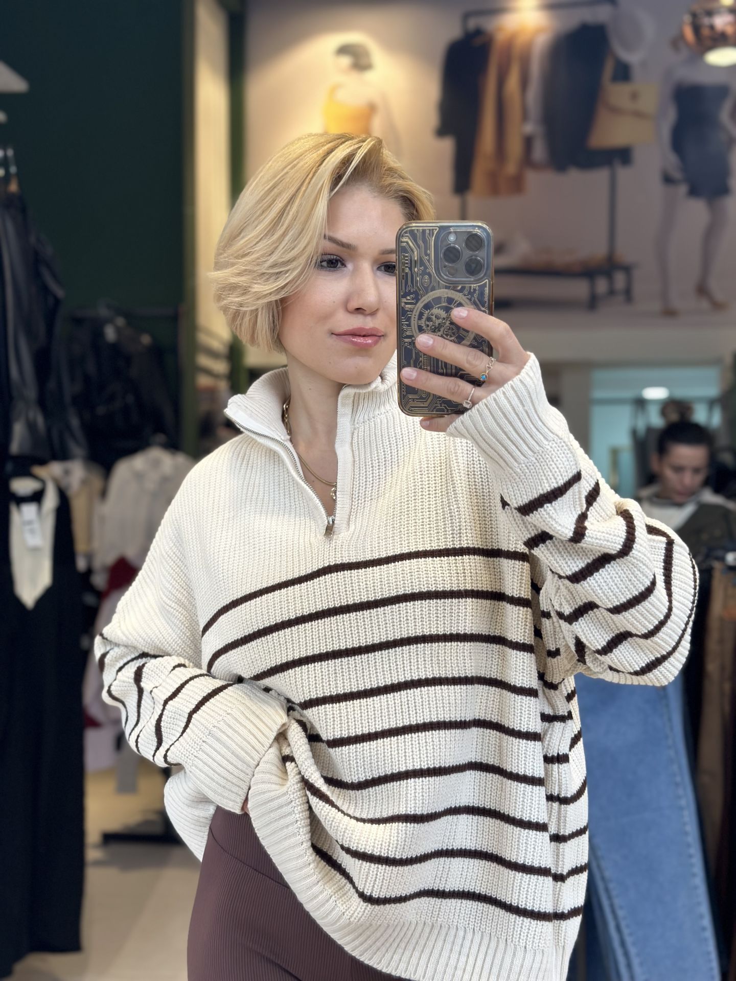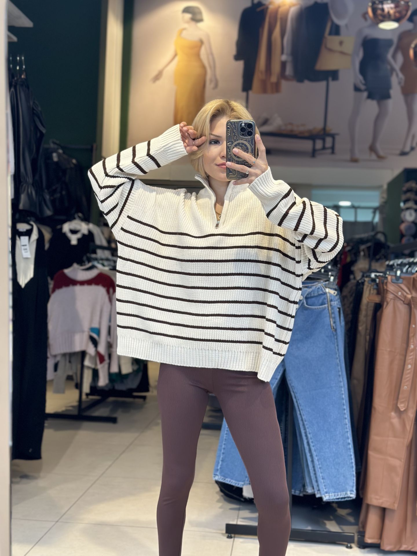 Oversize Kahverengi Çizgili Uzun Yarım Fermuarlı Kazak Oversize Kahverengi Çizgili Uzun Yarım Fermuarlı Kazak. SCST2935 Oversize Kahverengi Çizgili Uzun Yarım Fermuarlı Kazak