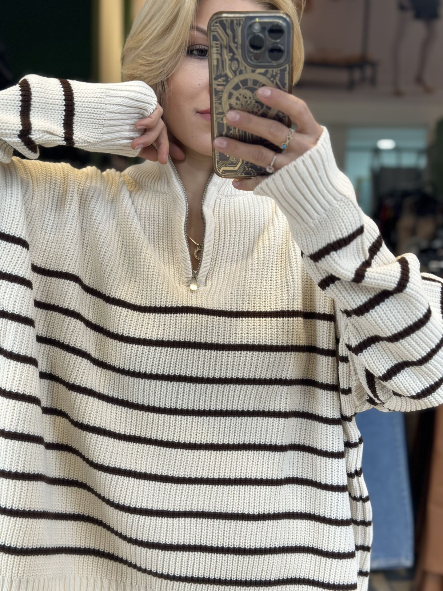 Oversize Kahverengi Çizgili Uzun Yarım Fermuarlı Kazak