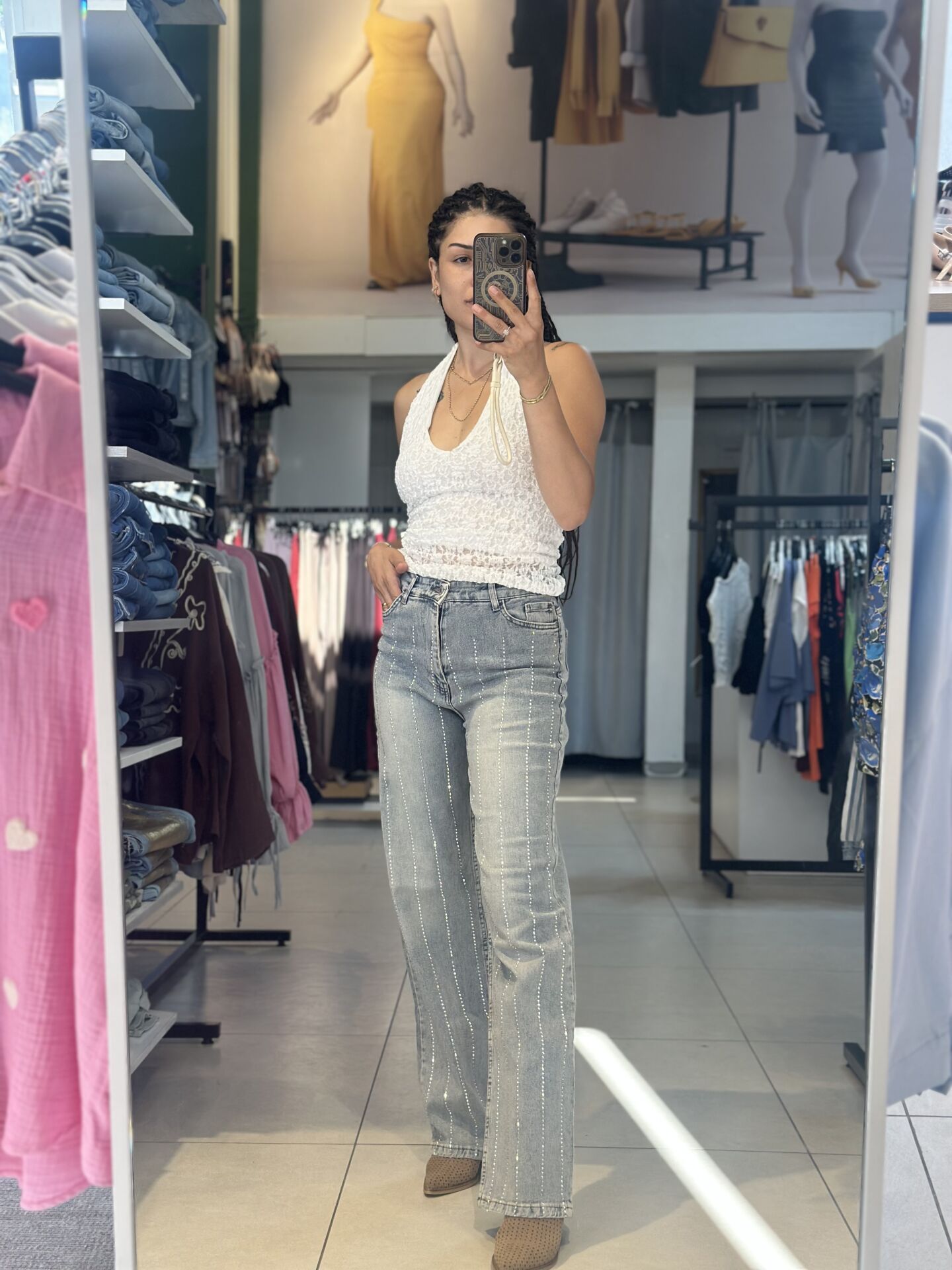 Bu şık şerit taşlı kot pantolonu gördün mü? Klasik kot pantolon tasarımına eklenen şerit detayları, günlük şıklığın vazgeçilmezi olacak. Hem rahat hem de tarz bir görünüm için ideal bir seçenek!