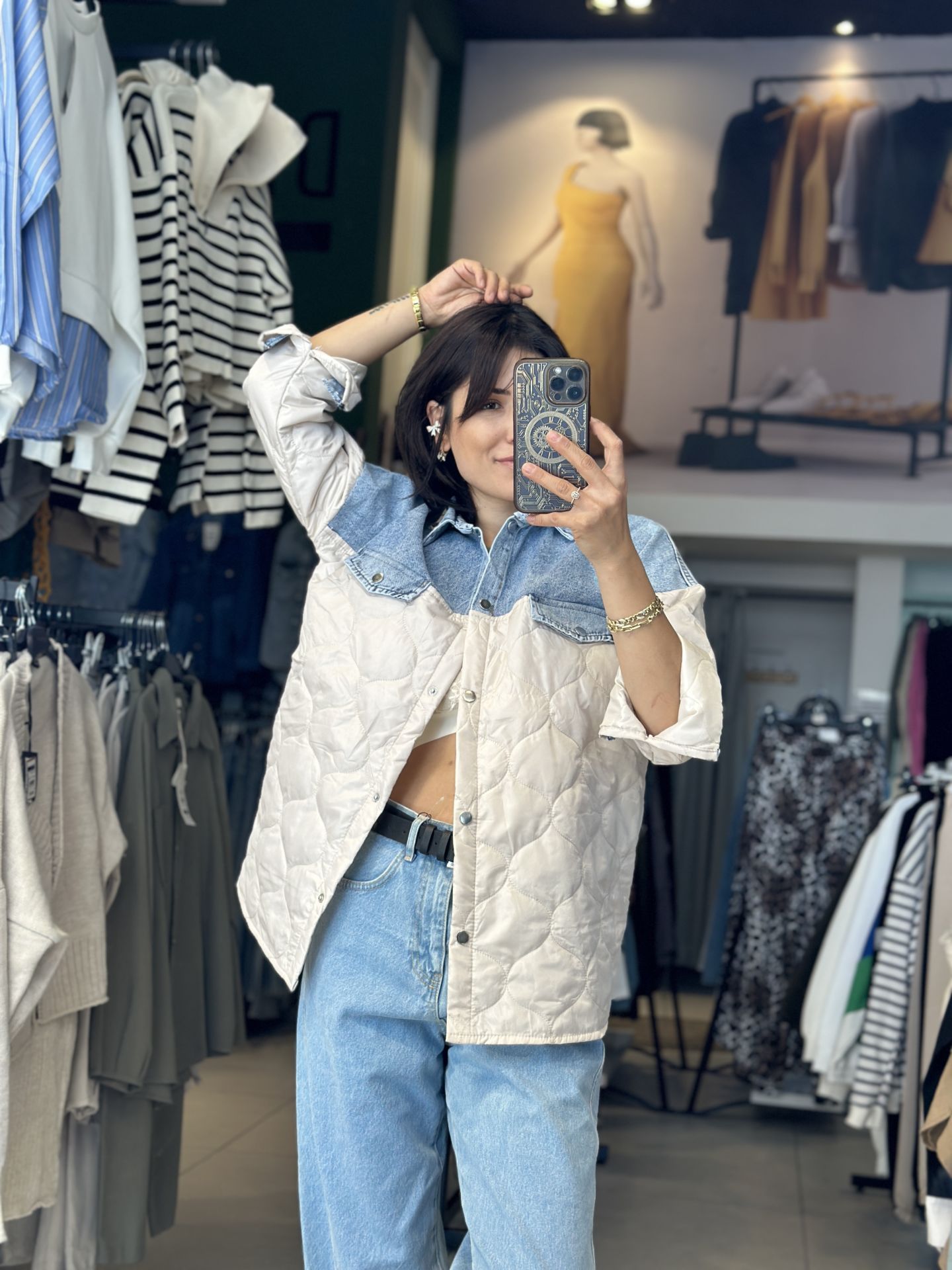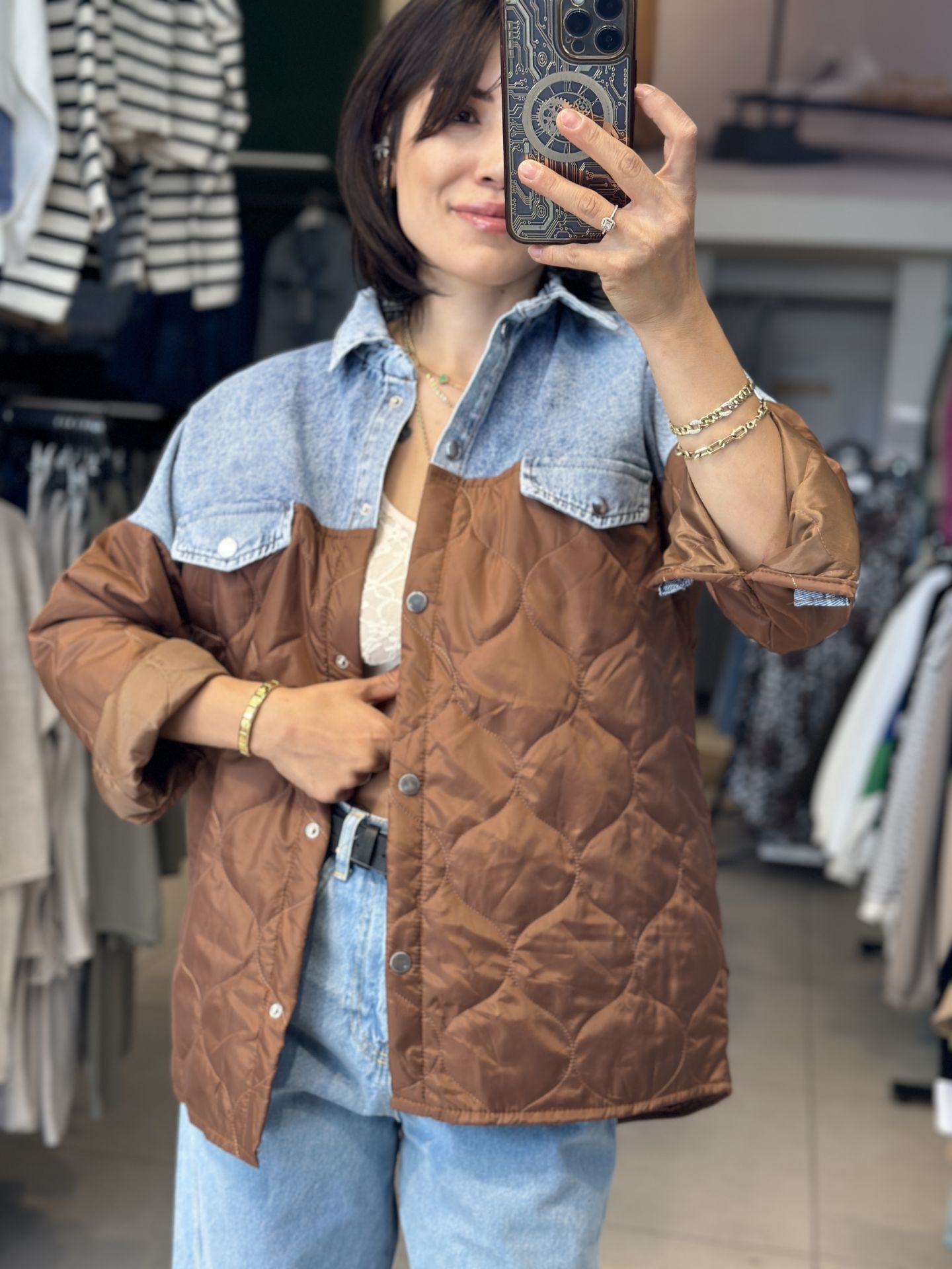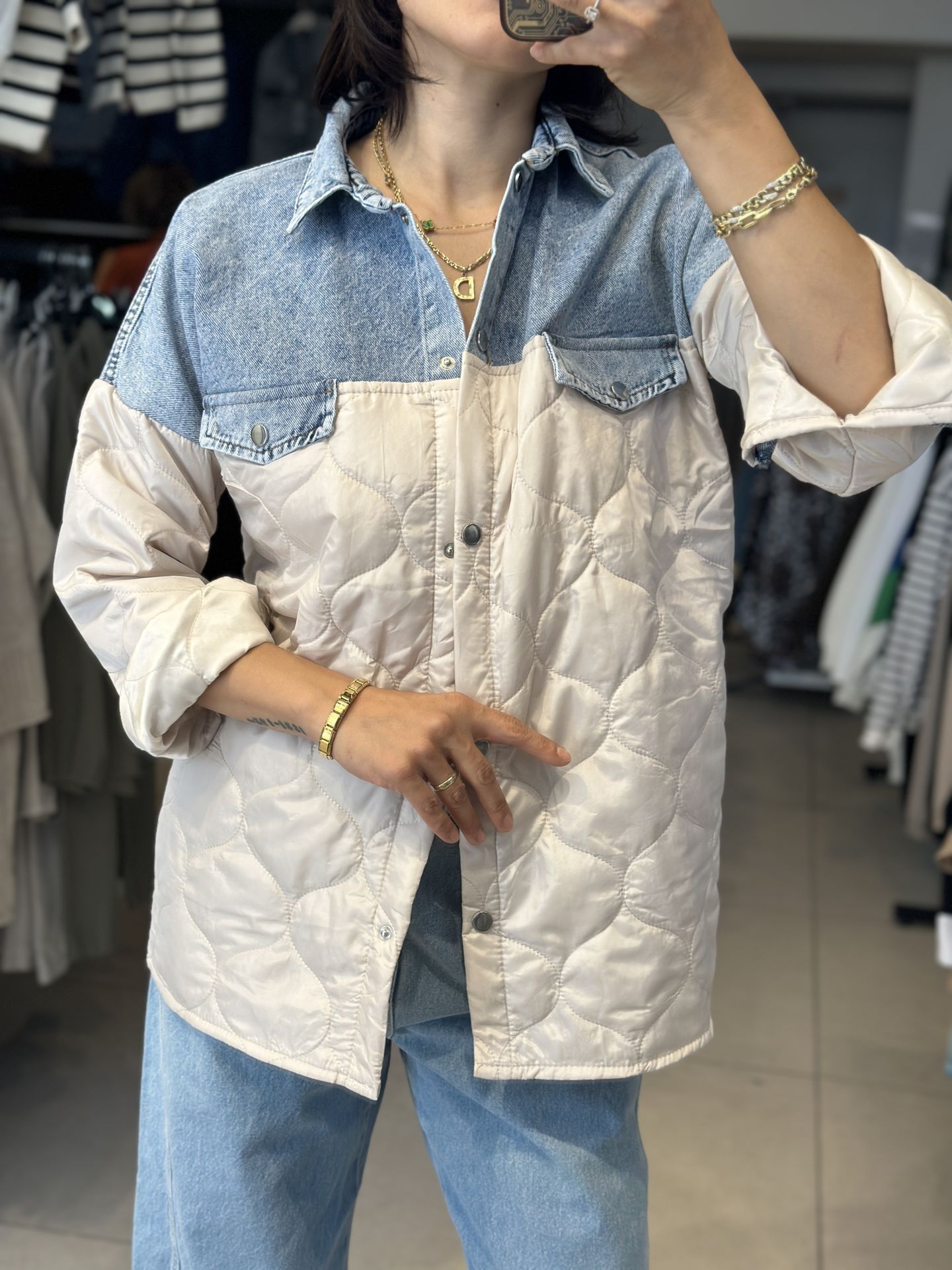 Uzun Kapitone Kot Parçali Ceket.Uzun Kapitone Kot Parçali Ceket