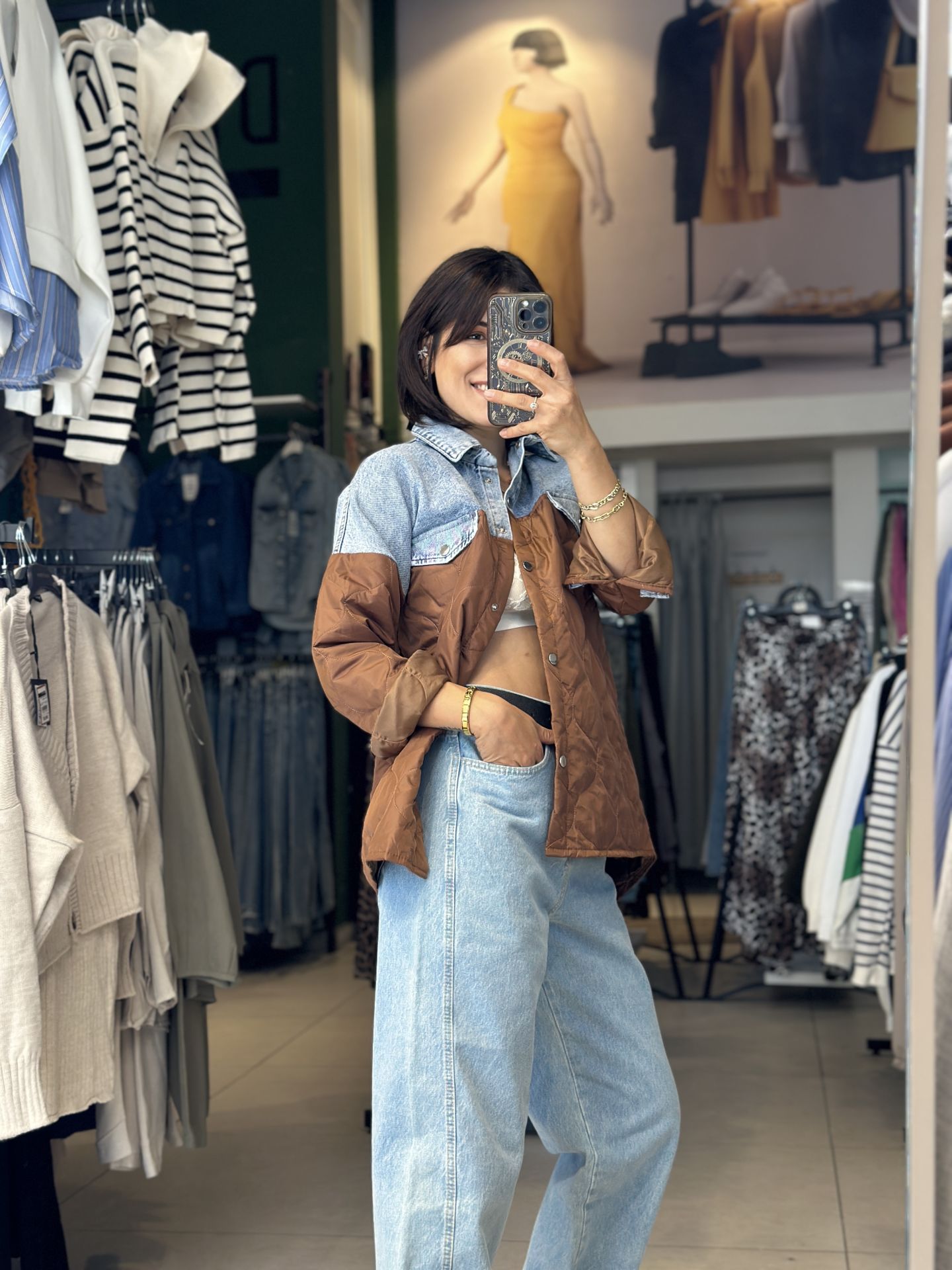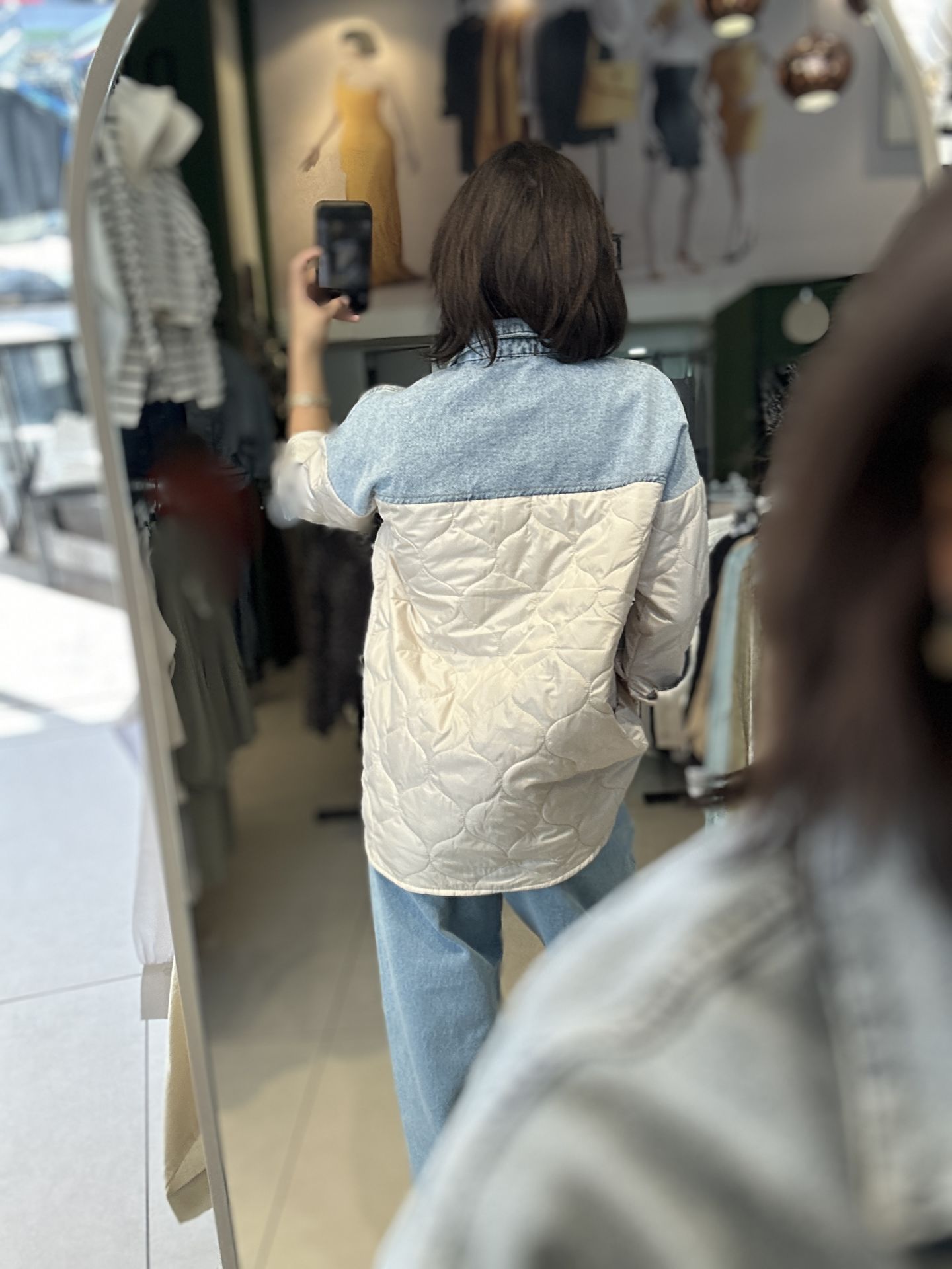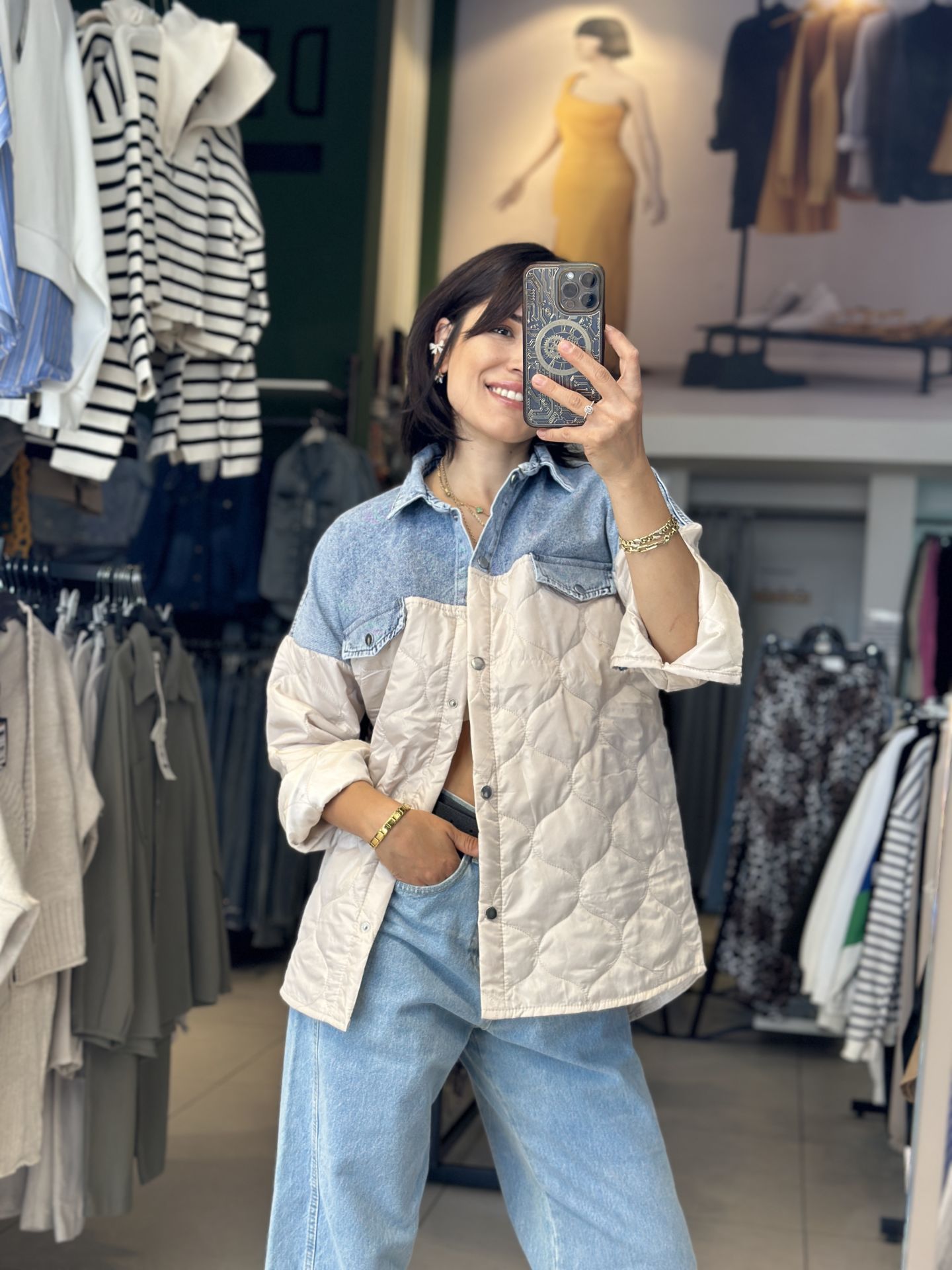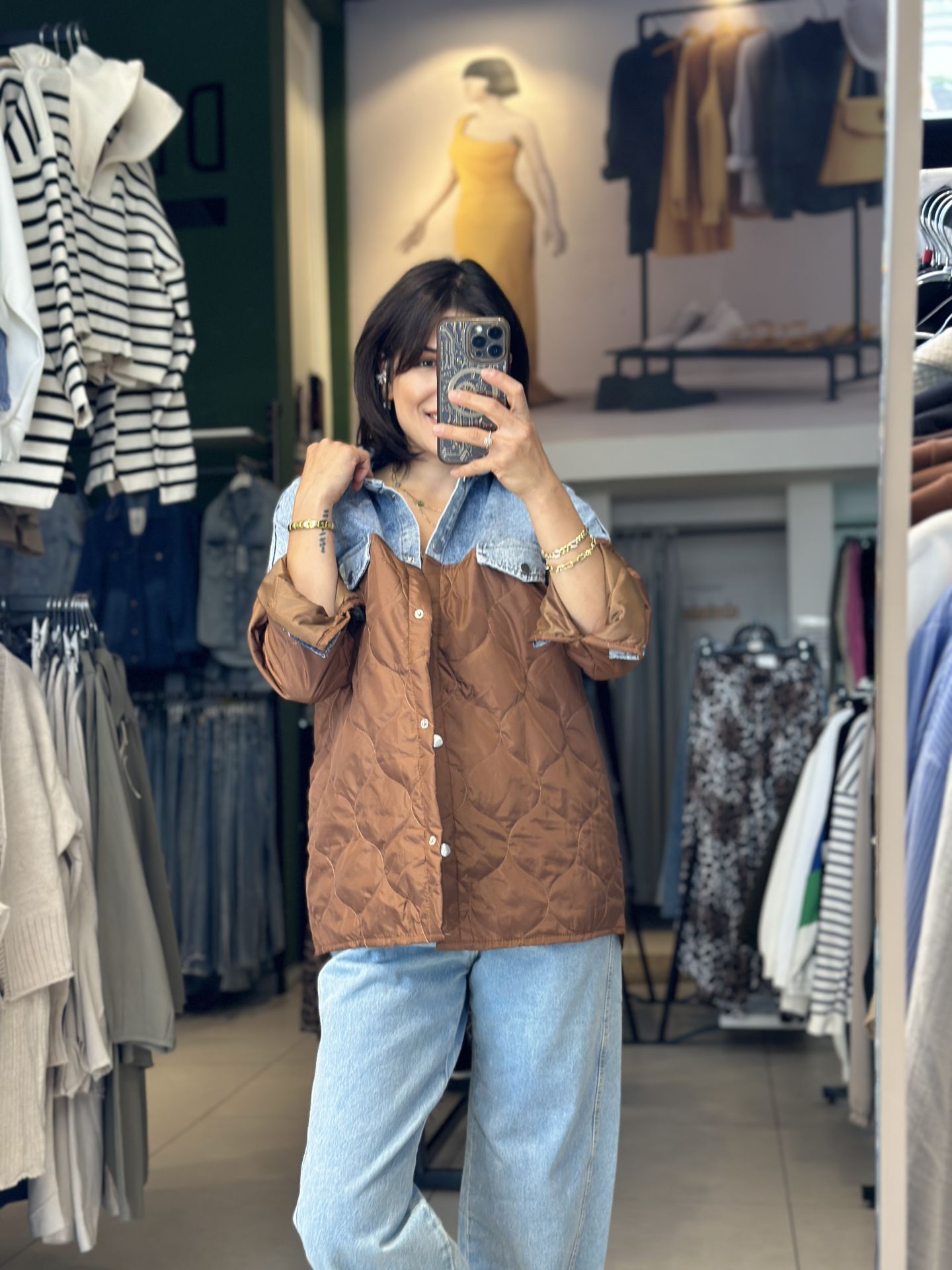 Uzun Kapitone Kot Parçali Ceket.Uzun Kapitone Kot Parçali Ceket