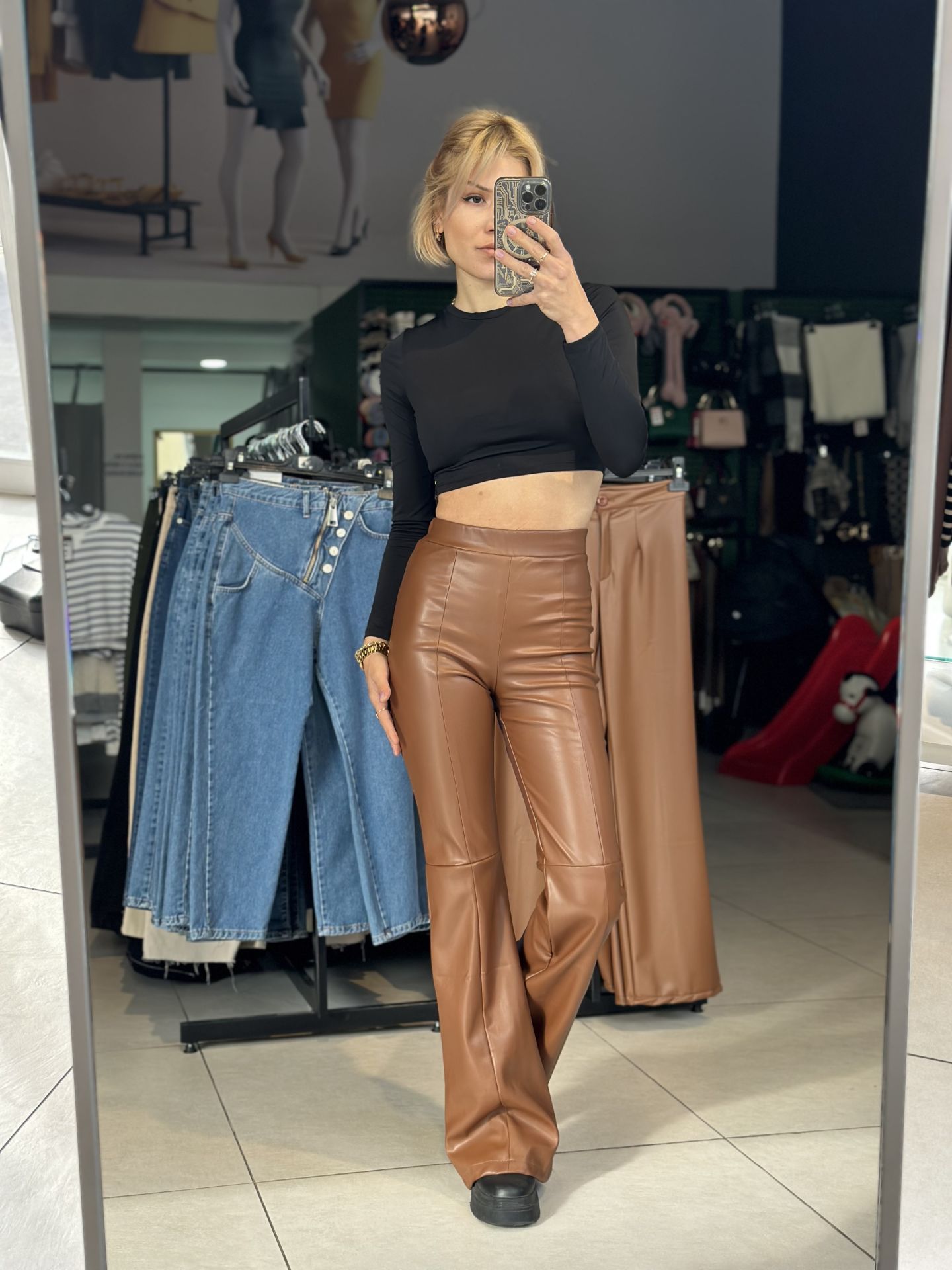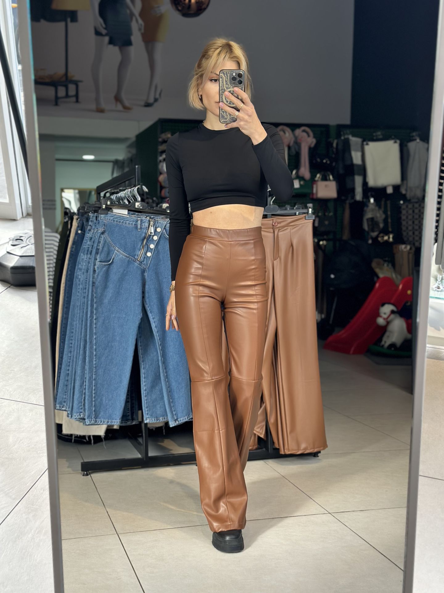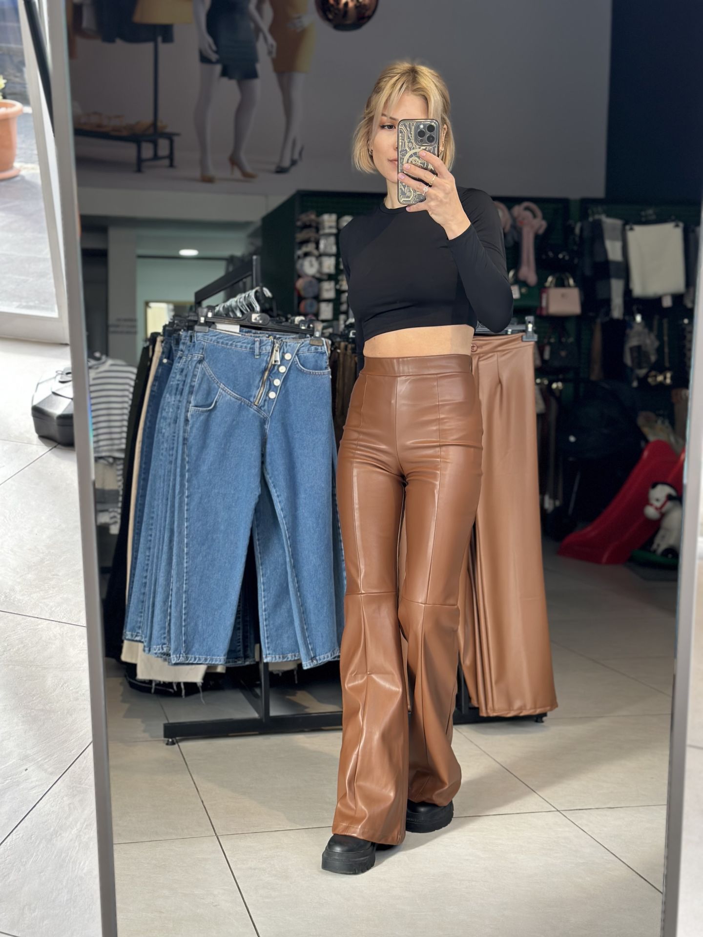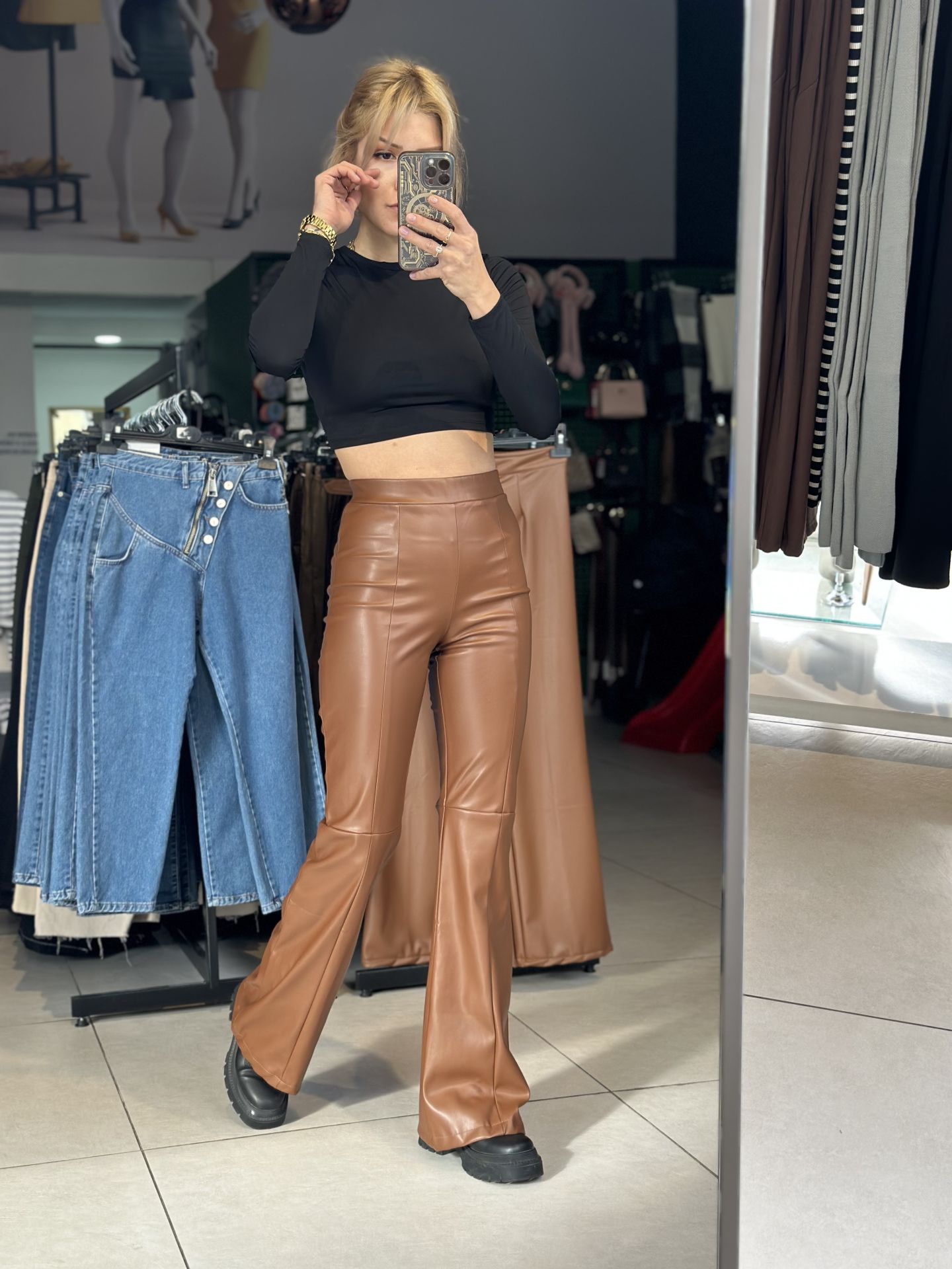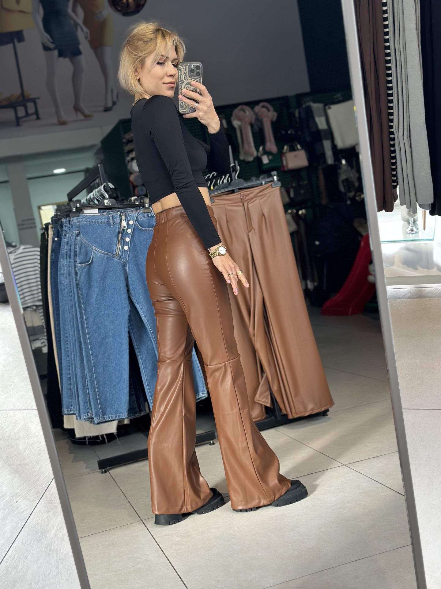 Yüksek Bel İspanyol Paça Deri Pantolon.